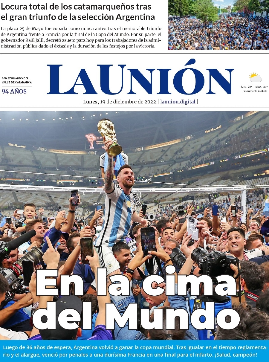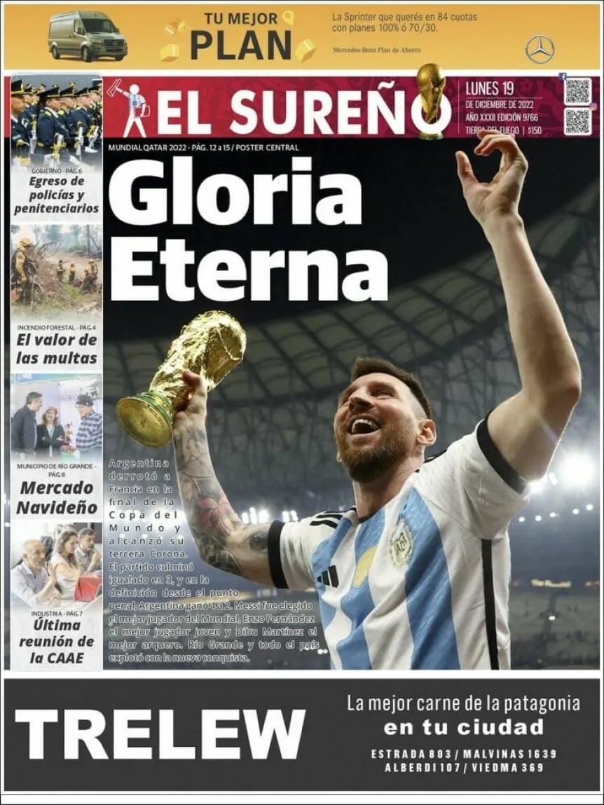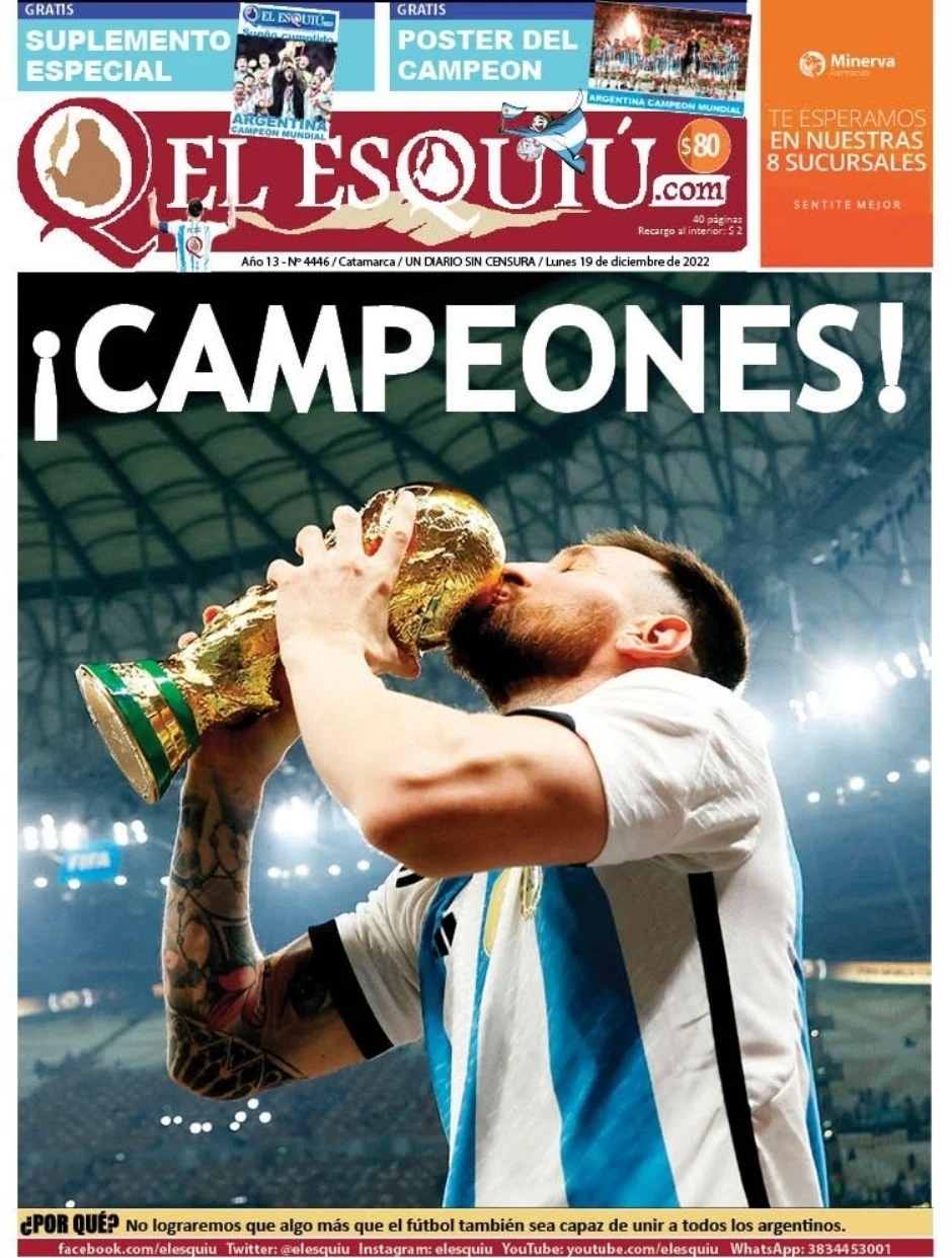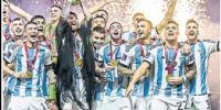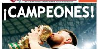 La prensa argentina obviamente amaneció este lunes con sus tapas prácticamente 'pintadas' de celeste y blanco. Desde distintos ángulos o momentos, la imagen central que se repite en casi todos los medios es la de Leo levantando la Copa, junto a titulares como "Campeones", "Campeones del Mundo" o "Tricampeones".