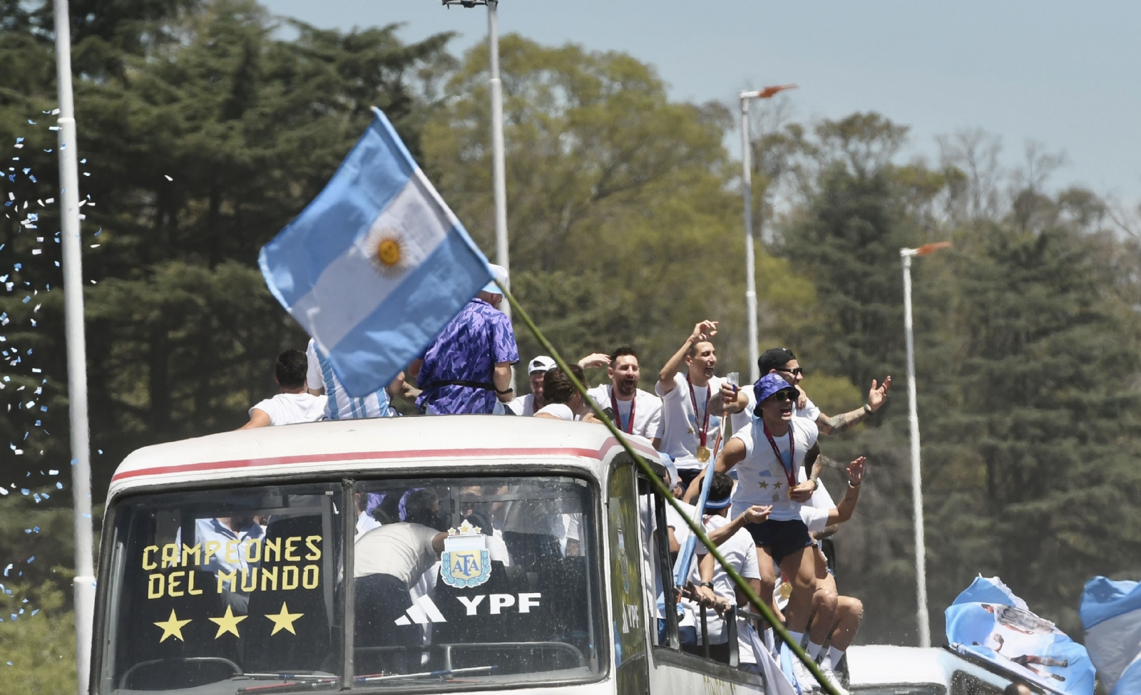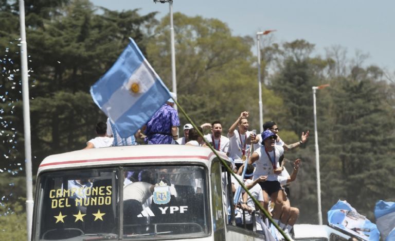 El plantel campeón se moviliza en un micro descapotable, especial para la ocasión, en el que recorrerán gran parte de la Ciudad de Buenos Aires para festejar la obtención del Mundial de Qatar 2022 con los hinchas que ya coparon varios puntos de la capital. Pese a los anuncios, no bajarán por la 9 de Julio hacia el Obelisco y solo saludarán desde la autopista.