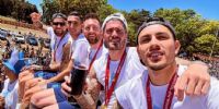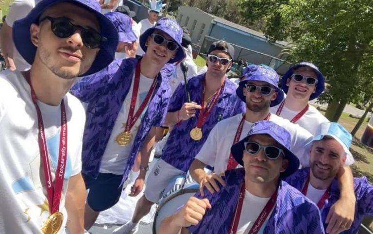 Mientras, los campeones del Mundo comparten en sus redes la caravana hacia los diferentes puntos de la Ciudad de Buenos Aires y desde arriba del micro mostraron los festejos con looks inéditos: una camisa violeta similar a la remera suplente, el sombrero “piluso” haciendo juego y otra camiseta con las tres estrellas con el celeste y blanco.