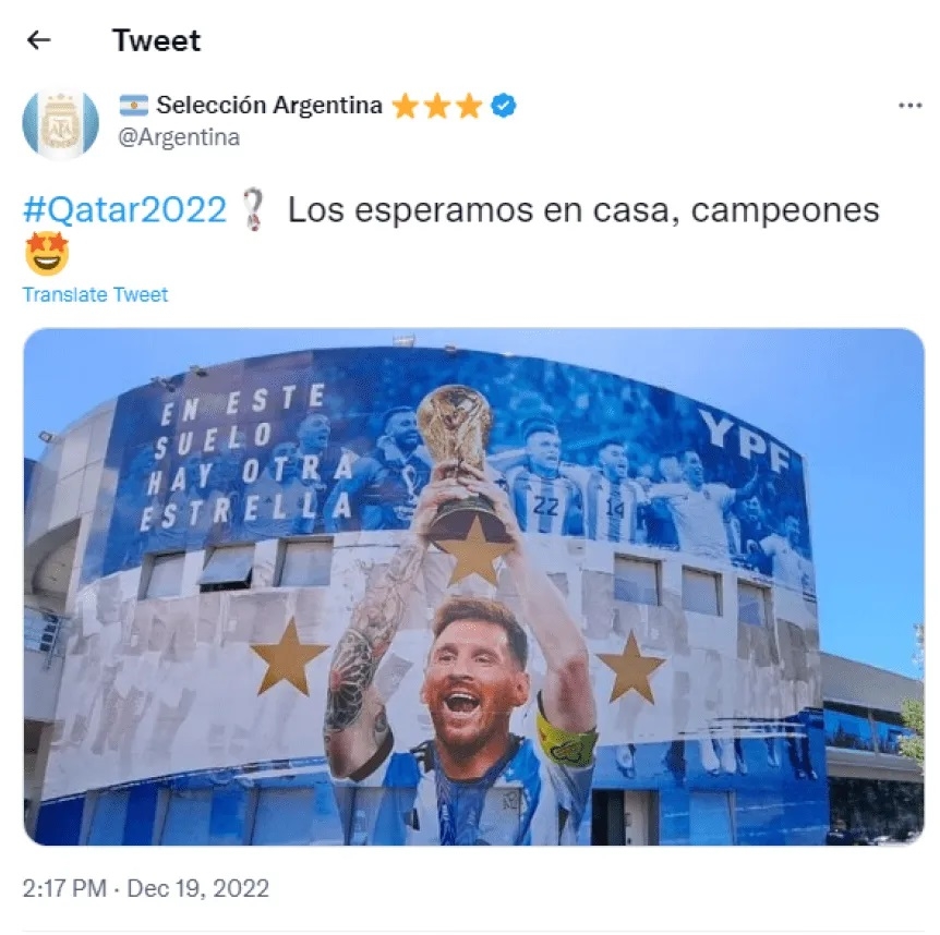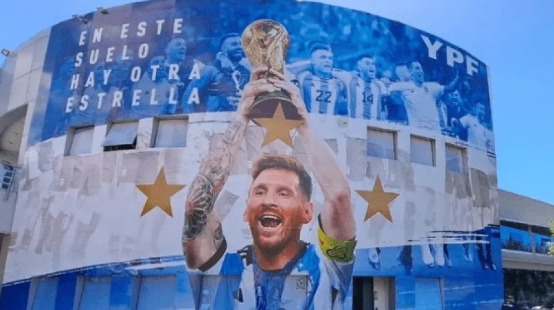 Con los colores celeste y blanco, el mural de YPF tiene como protagonista a Lionel Messi levantando la Copa del Mundo alrededor de tres estrellas doradas. Además, en la parte superior del mismo se ve al resto del plantel festejando de cara a los hinchas junto a la frase "en este suelo hay otra estrella".