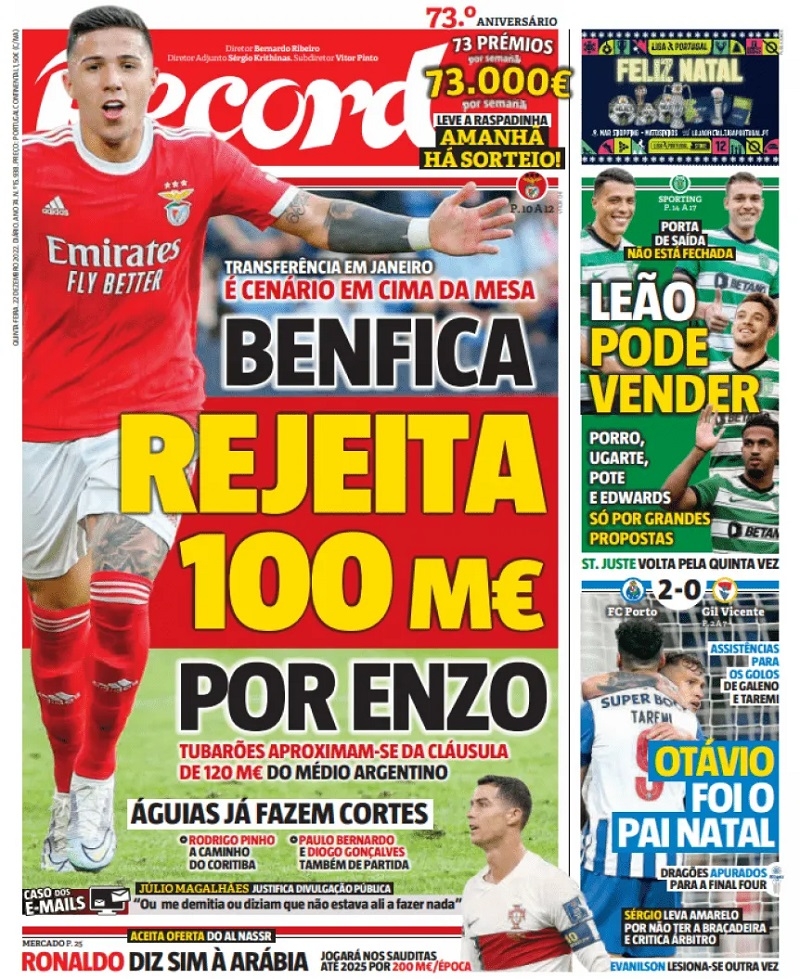 El diario Record de Portugal colocó a Enzo en su portada con la gran noticia de que las Águilas habrían dado su negativa a la millonaria oferta realizada por Liverpool, uno de los principales interesados en el ex-jugador de Defensa y Justicia.
