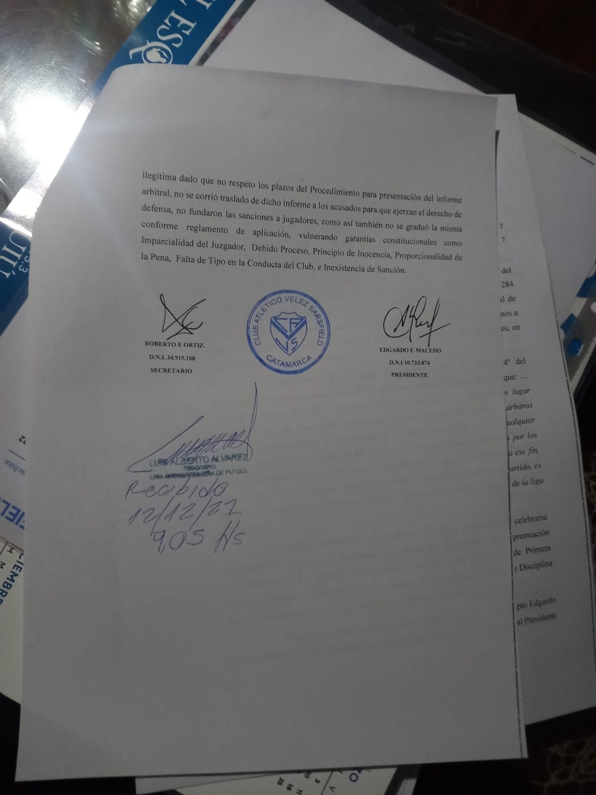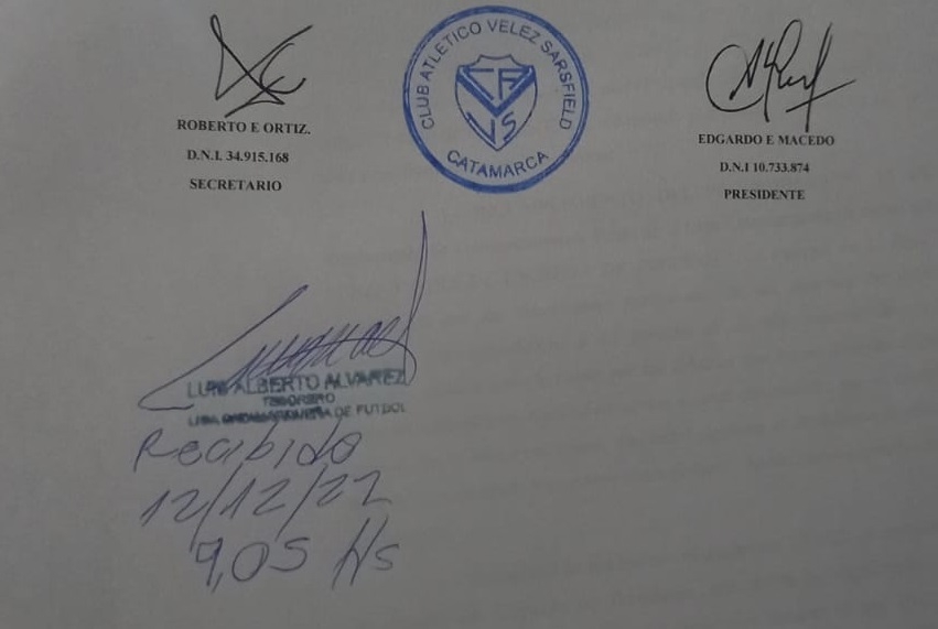 Ante esta nueva instancia, igualmente adversa, la dirigencia de Vélez hizo trascender que su presentación “cumplió con todas las formalidades”, y que “el Tesorero de la Liga Catamarqueña, Alberto Álvarez, reconoció haber recibido la apelación, con su rúbrica y la constancia de fecha y horario de la recepción, el 12/12/2022, a las 09,05 hs.”.