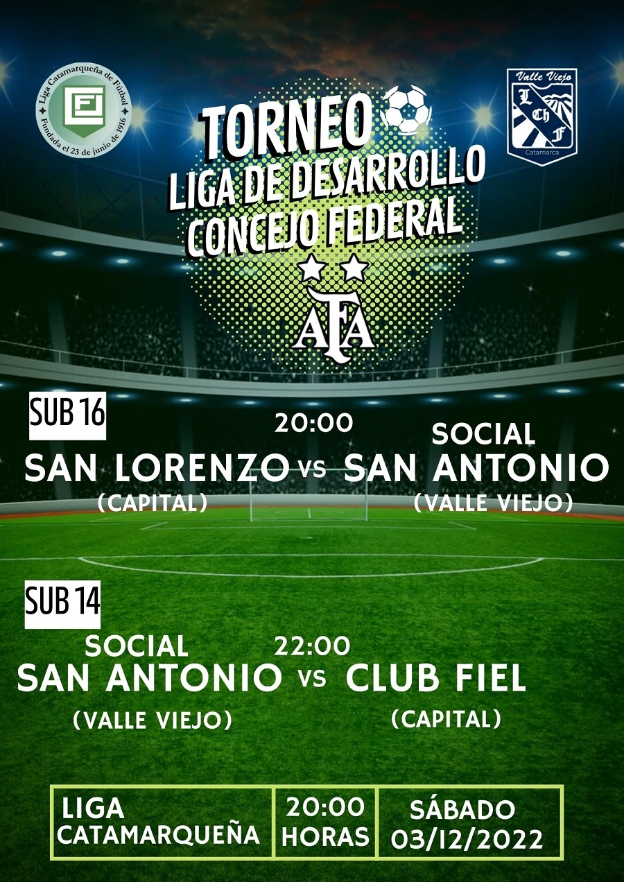 Con actividad en el estadio “Malvinas Argentinas” de la Liga Catamarqueña de Fútbol, en el primer turno de hoy, a las 20 hs., en la Cat. Sub16, se enfrentarán San Lorenzo de Alem (Capital) vs. Social San Antonio (Liga Chacarera); mientras que a las 22 hs., en Sub14 se cruzarán Fiel (Capital) y Social San Antonio (Liga Chacarera).