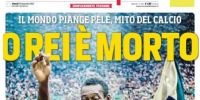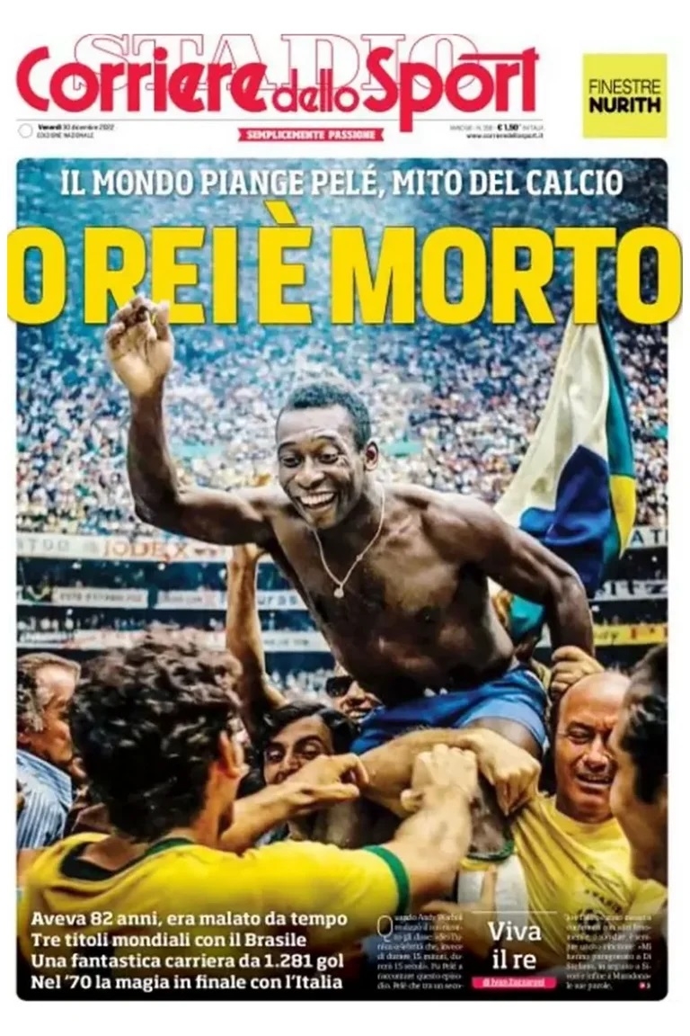 “El Rey ha muerto”. Este es el título que eligió el Corriere dello Sport de Italia con una imagen del máximo goleador histórico de Brasil -Neymar lo igualó en 77- levantado en andas por sus compañeros tras la consagración de una de las 3 Copas del Mundo obtenidas en su carrera. A continuación, agregaron su epígrafe: “El mundo llora a Pelé, un mito del fútbol”.