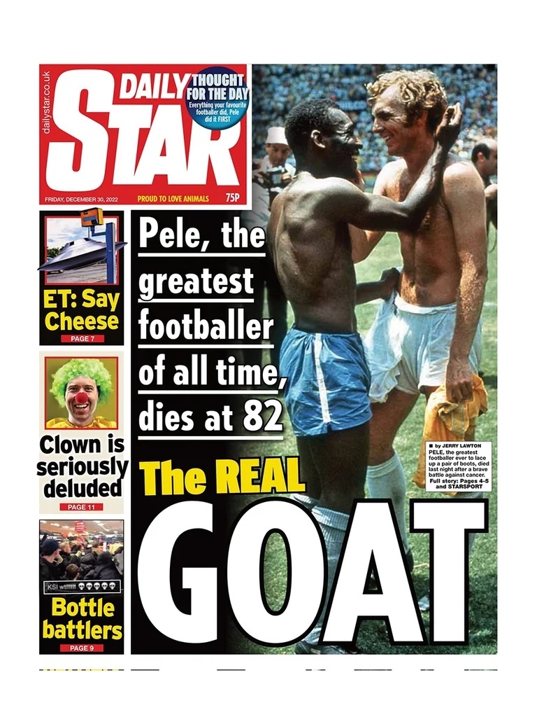 En estas mismas latitudes, el Daily Star apostó fuerte en su tapa de este viernes. Porque el periódico le tiró un palito por elevación a Lionel Messi, tras el título logrado con la selección argentina en Qatar: “El real GOAT”. La cocina de esta idea pudo tener que ver con uno de sus rivales editoriales, Daily Mirror, que definió con esa abreviatura a Messi después de la coronación de la selección argentina en el Mundial de Qatar. Esta es la frase que acompañó la imagen del ex futbolista en la portada con la singularidad de que la palabra protagonista apareció en letras grandes. “Pelé, el mejor futbolista de todos los tiempos, murió a los 82 años”, agregó para explicar la sigla detallada anteriormente.