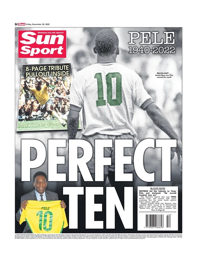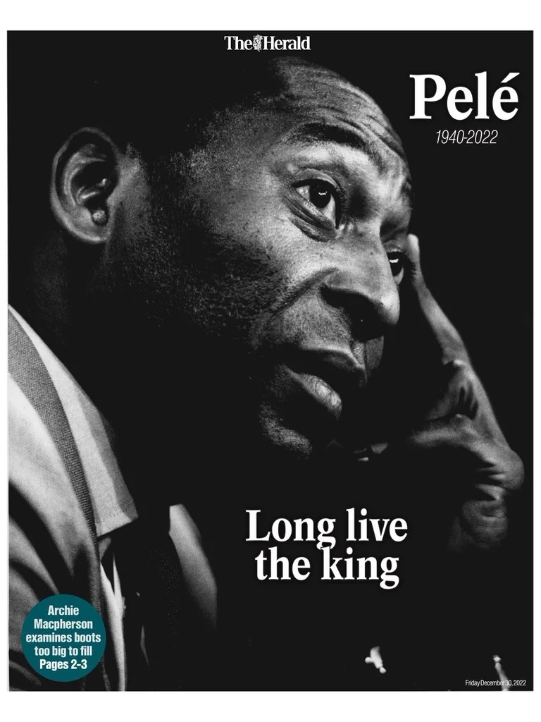 El diario escoces The Herald mostró el fallecimiento con una imagen de Pelé, que tiene una de sus manos apoyadas en la cabeza, en un carácter pensativo y la siguiente oración: “Larga vida al rey”. Su tapa estuvo enteramente dedicada al fallecimiento del ex jugador en el hospital Albert Einstein de San Pablo.