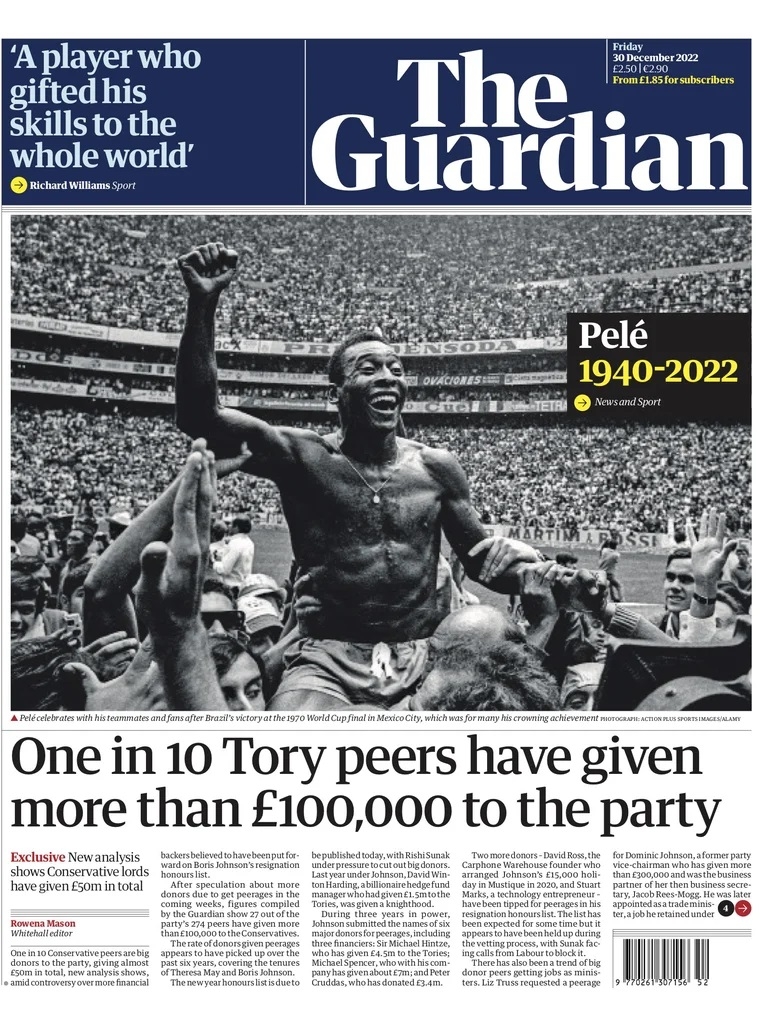 El diario británico The Guardian optó por dejar este hecho en el centro de la tapa. El instante que eligieron para dar a conocer el suceso se remonta al festejo de Pelé después de la consagración en el Mundial 1970, tras convertir uno de los goles en la final que ganó la Canarinha por 4-1 ante Italia en México. Además, está acompañado de la palabra “Pelé” con los respectivos años del natalicio y su adiós.