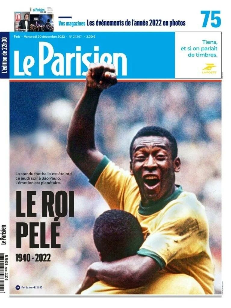 Esta misma foto fue la seleccionada por el periódico francés Le Parisien en una primera plana que fue invadida por el fallecimiento del único jugador de la historia que ganó tres Mundiales. “El Rey Pelé”, fue el título elegido por este medio, que acompañó su sentir con un breve párrafo en la parte superior de esta frase: “El astro del fútbol falleció en la noche del jueves en San Pablo. La emoción es planetaria”.