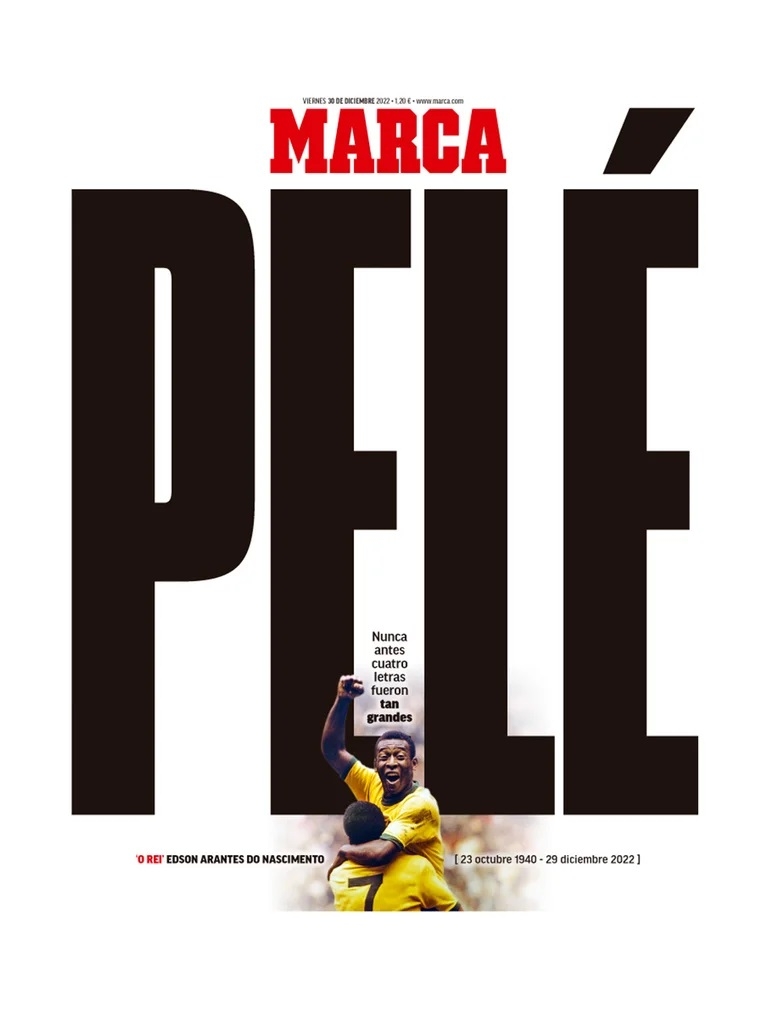 Una de las portadas más significativas tuvo lugar en España con Marca. El diario madrileño evitó una foto de grandes proporciones en la primera página. Ocupó toda la extensión de la hoja con las cuatro letras del apodo que dio nombre a Edson Arantes do Nascimento y, en un tamaño pequeño, escribió: “Nunca antes cuatro letras fueron tan grandes”. A continuación, dejó una de las imágenes del ex jugador con la camiseta de Brasil sumado a la información necrológica vinculada a su nacimiento y deceso.