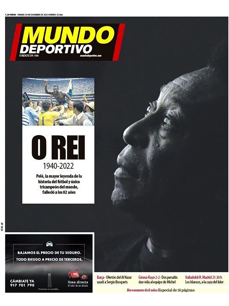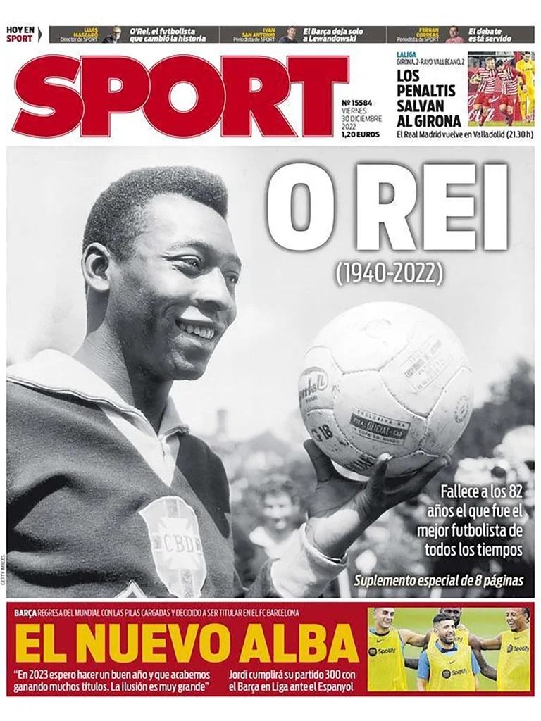 Al igual que Marca, Mundo Deportivo continuó en la misma sintonía. A pesar del reinicio dado en La Liga de España después del Mundial, este hecho se llevó los flashes internacionales con una primera página dedicada al fallecimiento de la máxima figura futbolística en la historia de Brasil: “Pelé, la mayor leyenda de la historia del fútbol y único tricampeón del mundo, falleció a los 82 años”.