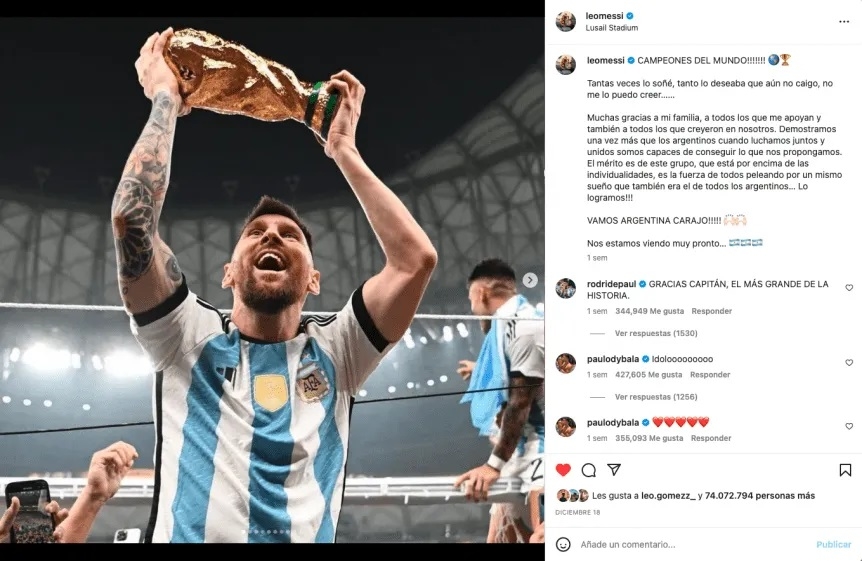 Luego de conquistar el Mundial de Qatar 2022 con la Selección Argentina y de alzar por los aires del Estadio Lusail su tan anhelada Copa del Mundo, Lionel Messi subió a su cuenta de Instagram una foto suya con el trofeo más importante de su vida y en cuestión de horas aquella publicación se transformó en la más likeada en la historia de la red social. Sin embargo, los "me gusta" siguen aumentando a paso firme.