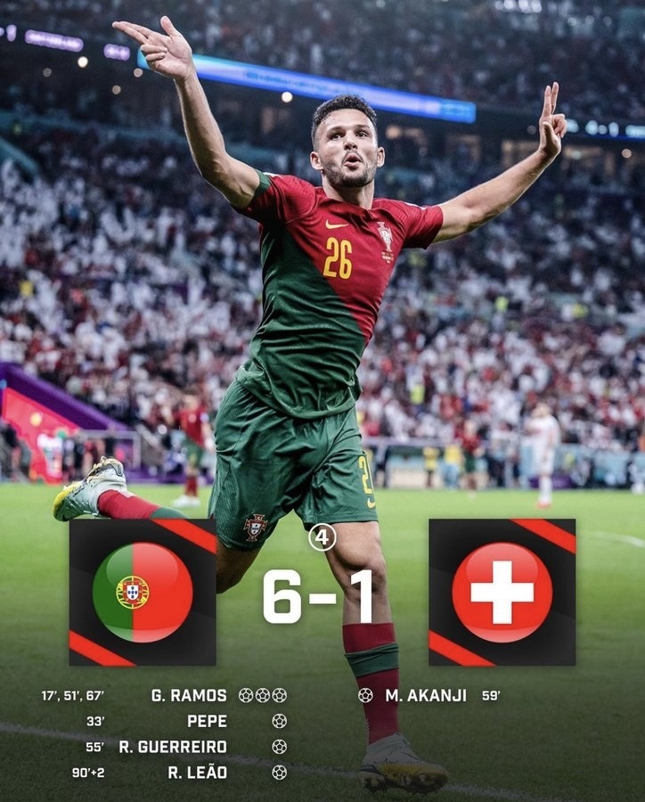 En el complemento, Portugal salió con todo en búsqueda de liquidar el partido y en apenas seis minutos volvió a aparecer Ramos, que empujó un buscapié de Diogo Dalot y empezó a establecer la goleada, que siguió agrandando Raphael Guerreiro minutos más tarde con una gran definición. A los 13 minutos, Manuel Akanji descontó, pero lejos de sentirlo, los lusos fueron por más. A los 22 minutos, luego de una gran combinación ofensiva, Ramos la picó con clase ante el achique de Sommer y decretó su hat-trick. En el descuento, Rafal Leao le puso cifras definitivas al 6-1 con un golazo y, de esta manera, Portugal se metió en los cuartos de final del Mundial de Qatar 2022 y enfrentará a Marruecos.