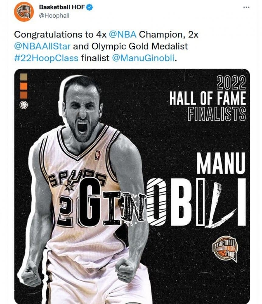 Este viernes podía ser otro día histórico para el básquet argentino y, en especial, para Emanuel Ginobili. Y lo fue. Manu sigue en carrera para ingresar al Salón de la Fama, tras el anuncio de los finalistas Clase 2022 que hizo el Naismith Memorial Basketball Hall of Fame. El bahiense estaba nominado por el Comité Norteamericano.