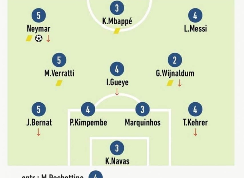 El puntaje más bajo de PSG fue para el neerlandés Georginio Wijnaldum (con dos), mientras que hubo tres jugadores que recibieron justamente esa calificación: el español Keylor Navas, el brasileño Marquinhos y Kynian Mbappé, quien había sido el héroe con su agónica conquista frente al Merengue.