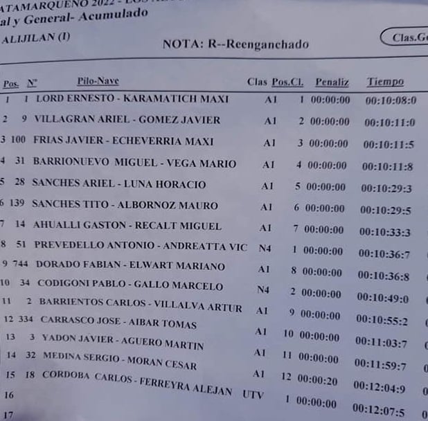 La clasificación general y clase A1 es dominada por el tucumano Ernesto Lord con Maxi Karamatich que debutaron en un impecable VW Gol del Mataresse Competición.