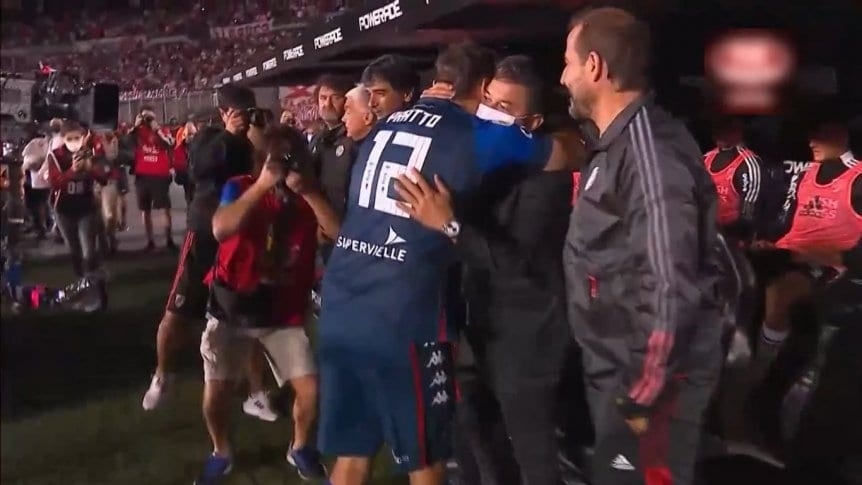 Primero, Pratto le dio la mano y un beso a Pablo Dolce, simplemente por una cuestión de orden, y luego se dio un cálido abrazo con Marcelo Gallardo. Tras su reencuentro con el Muñeco, continuó con los saludos para el resto del banco.