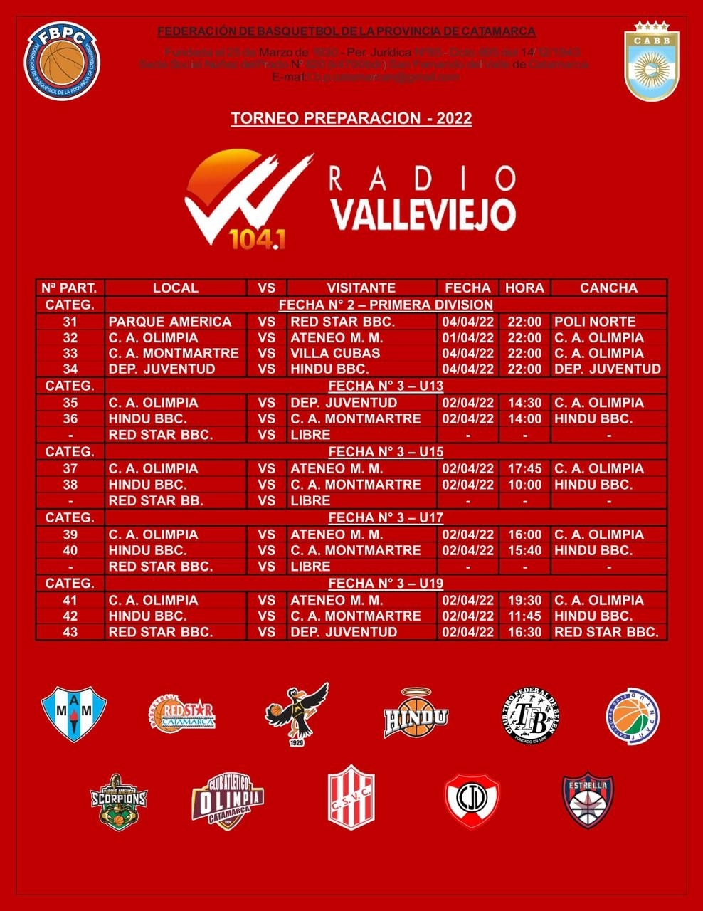 La Federación de Básquetbol de la Provincia de Catamarca dio a conocer la programación de este fin de semana para su Torneo Preparación 2022, que entre este viernes 01/04 y el lunes 04/04 disputará la 2da. fecha de la 1ra. División y la 3ra. para las U19.