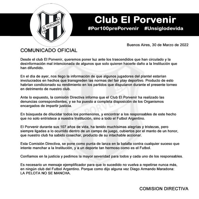 A través de un comunicado oficial, el club denunció la situación y aseguró que ya hizo las presentaciones correspondientes para que la justicia deportiva y civil investiguen lo sucedido. "Me genera mucha vergüenza tener que contar esto, estoy muy triste. Lo que pasó en El Porvenir con las apuestas clandestinas tiene que ser investigado en otras instituciones de la categoría. Ya hice la denuncia del caso, tengo que estar cubierto, porque esto es algo gravísimo", dijo Merelas al sitio web Depo.