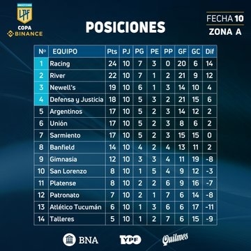 En la Zona A la clasificación de Racing y River no estará en riesgo en esta jornada venidera, pero Banfield (14) tratará de acercarse a Newell´s (19) en Rosario mientras que Defensa (18) deberá defender lo suyo ante un ascendente Sarmiento (17) en Junín.