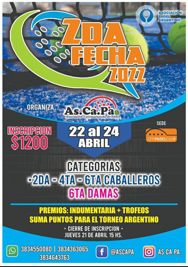 Con inscripciones que se tomarán al 3834550080, hasta este jueves a las 15.00, se pone en juego el próximo fin de semana, la 2da Fecha de las categorías pares, de la Asociación Catamarqueña de Pádel (As.Ca.Pa.), con sede en Citi Pádel.