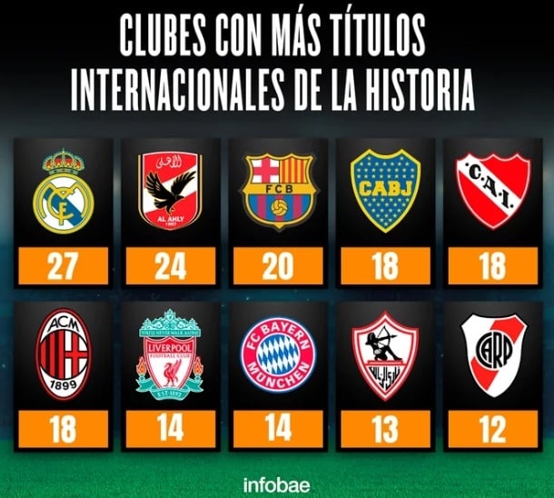 Al ser una tabla global con copas internacionales, se da el caso particular del Al Ahly de Egipto que es segundo en el raking con 24 conquistas. El podio lo completa el Barcelona de España (20) y dos equipos argentinos cierran el top cinco, Boca Juniors e Independiente, ambos con 18, al igual que el Milan.
