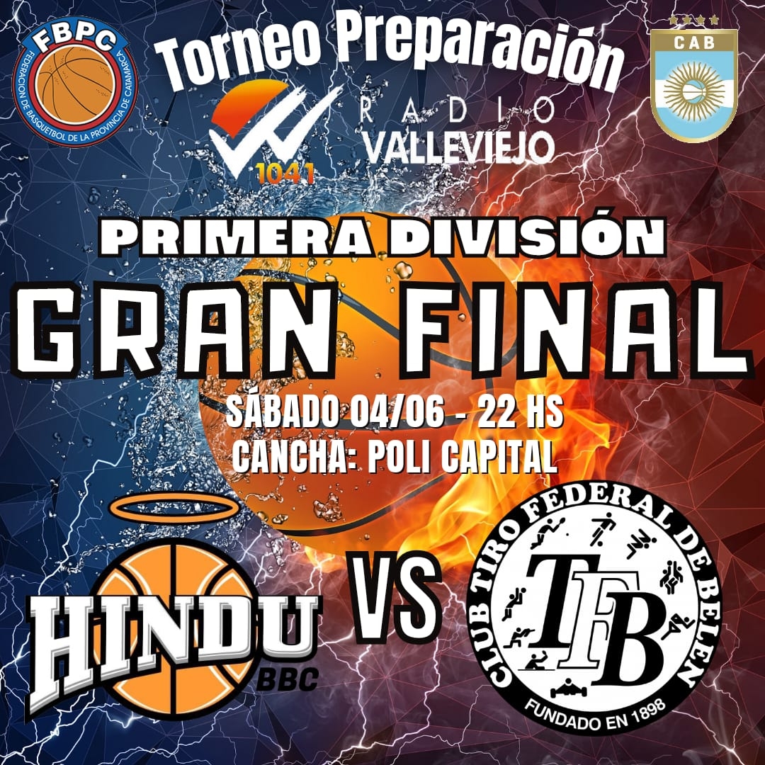 La Federación de Básquetbol de la Provincia de Catamarca informa que la Gran Final de Hindú BBC y Tiro Federal de Belén Primera División de su Torneo Preparación “Radio Valle Viejo”, que lleva el nombre en homenaje de José Antonio “Papi” Castillo, se realizará el próximo sábado 4 de junio a las 22 hs en el Polideportivo Fray Mamerto Esquiú.