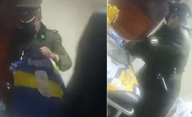 En efecto, los agentes de seguridad entraron al vestuario de los jueces y revisaron las bolsas de los obsequios. “Son cuatro”, se escucha decir a uno de los oficiales en el video que difundió el departamento de prensa del club y que publicó el periodista Jaime Vega, de Radio La Tremenda. Quienes quedaron a cargo de la requisa fueron sacando de los envoltorios distintas camisetas de la visita; se pueden observar una blanca y una azul y amarilla.