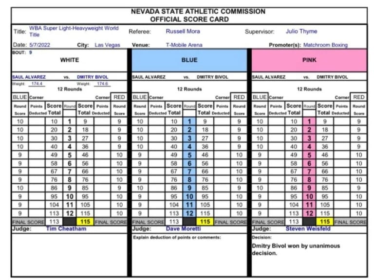 Poco después se compartieron las tarjetas oficiales en las que se puede apreciar que el pugilista ruso ganó por decisión unánime, ya que los jueces Tim Cheatham, Dave Moretti y Steven Weisfeld dieron el mismo puntaje en cada round.
