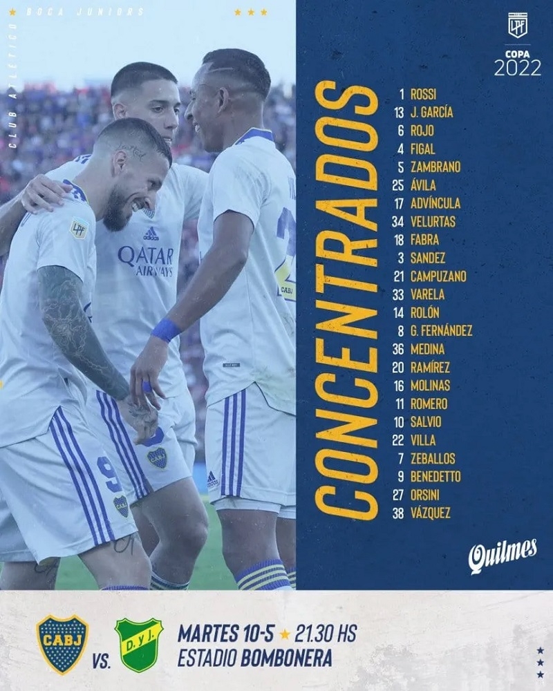 Agustín Rossi; Luis Advíncula, Carlos Zambrano, Marcos Rojo, Frank Fabra; Óscar Romero, Alan Varela, Pol Fernández; Eduardo Salvio, Sebastián Villa y Darío Benedetto.
