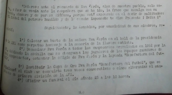 En 1952, 19 días después de la muerte de Eva Duarte, la esposa del entonces presidente Juan Domingo Perón, la Asociación del Fútbol Argentino (AFA) dispuso en una asamblea extraordinaria la creación de la Copa de Oro “Eva Perón, Benefactora del fútbol”, reservada para un campeón superlativo: aquel club de Primera División que se adjudicara tres campeonatos consecutivos o cinco de manera alternada.