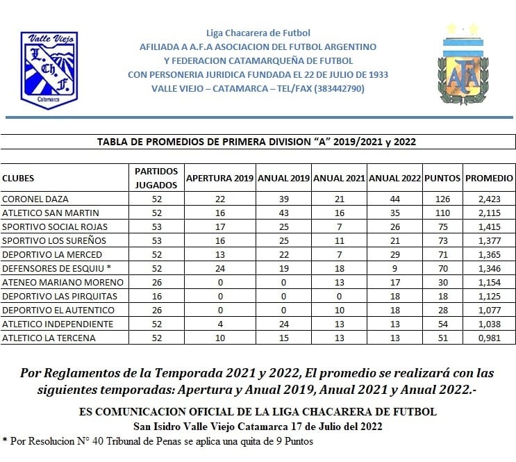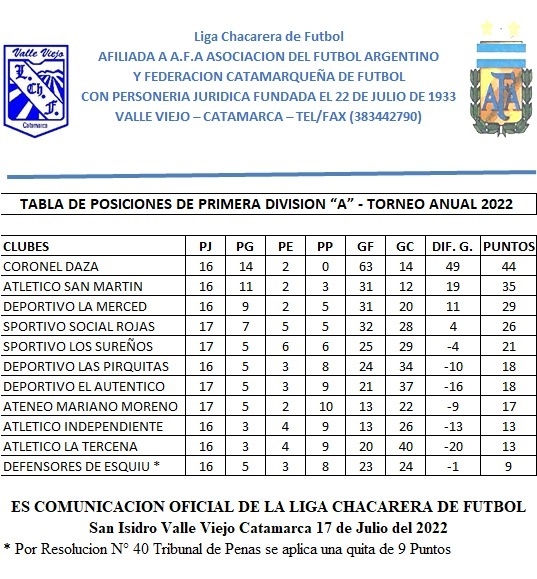 1ra. “A”: Coronel Daza 44 Pts.; San Martín 35, La Merced 29, Social Rojas 16, Los Sureños 21, Las Pirquitas y El Auténtico 18; Ateneo Mariano Moreno 17, Independiente SA y La Tercena 13 y Def. de Esquiú 9 (*) unidades. (*) Se le descontaron 9 puntos por Res. Nro. 40 del Tribunal de Penas, ratificada por el Consejo Federal.