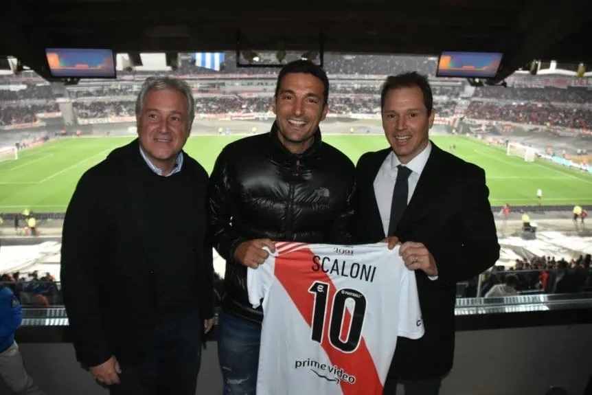 El presidente y el vice Matías Patanian se sacaron una foto con el verde césped de fondo y le obsequiaron una camiseta de River con el número 10 a Scaloni, quien no pudo ocultar su sonrisa.