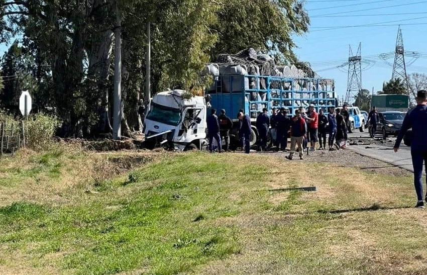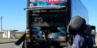 En las imágenes se pueden apreciar los daños materiales de ambas unidades: la trompa destrozada del vehículo con carga que terminó a un costado de la ruta y el motor del micro de larga distancia.
