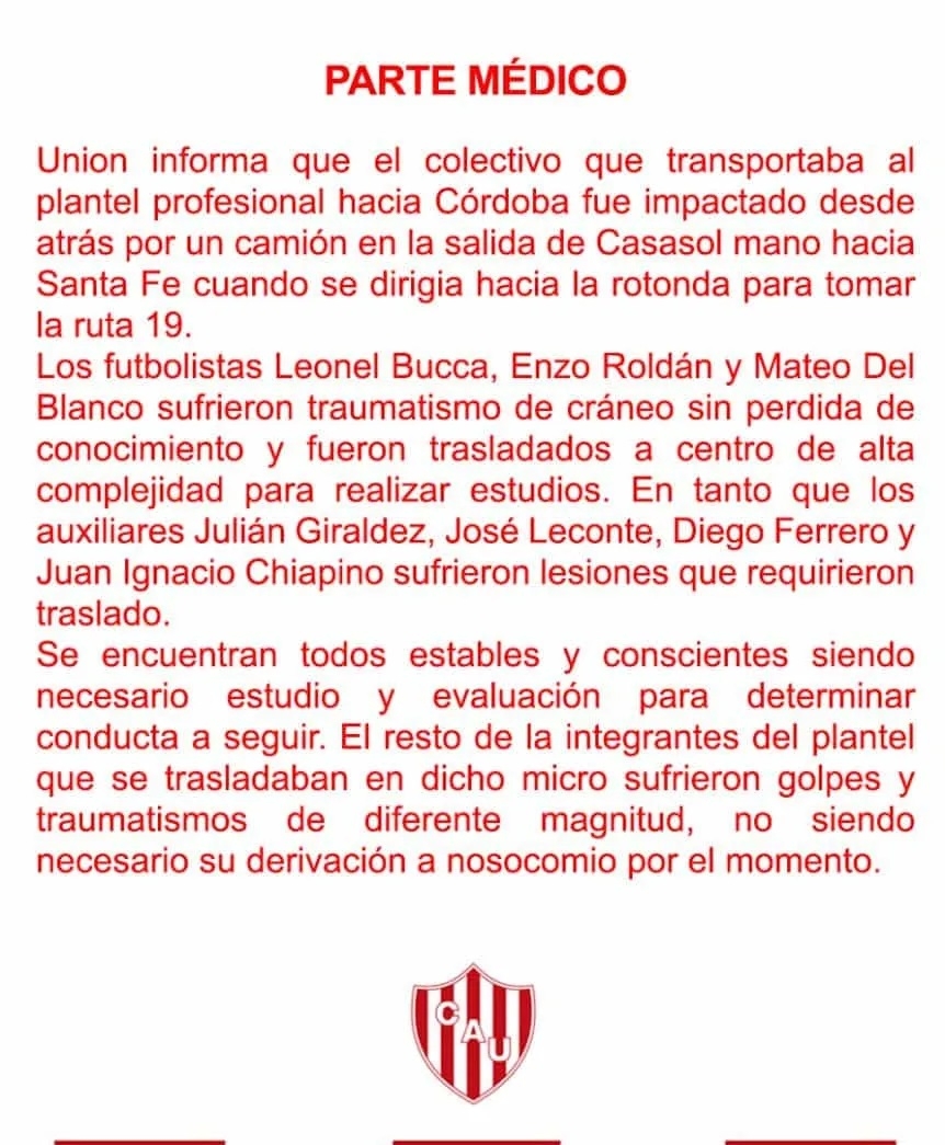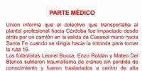 "Leonel Bucca, Enzo Roldán y Mateo Del Blanco sufrieron traumatismo de cráneo sin pérdida de conocimiento y fueron trasladados a centro de alta complejidad para realizar estudios".