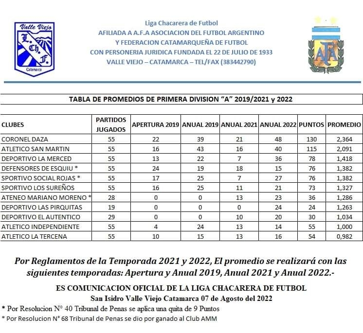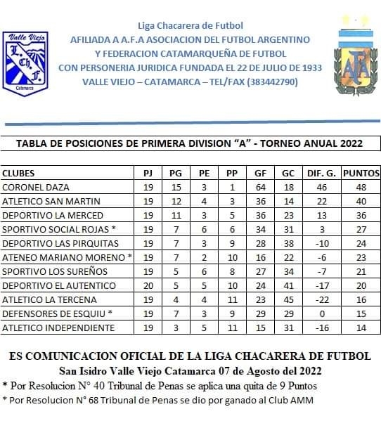 1ra. “A”: Coronel Daza 48 Pts.; San Martín 40, La Merced 36, Social Rojas 27, Las Pirquitas 24, Ateneo Mariano Moreno 23, Los Sureños 21; El Auténtico 20; La Tercena 16; Def. de Esquiú 15 (*), e Independiente SA 14 unidades. (*) Se le descontaron 9 puntos por Res. Nro. 40 del Tribunal de Penas, ratificada por el Consejo Federal.