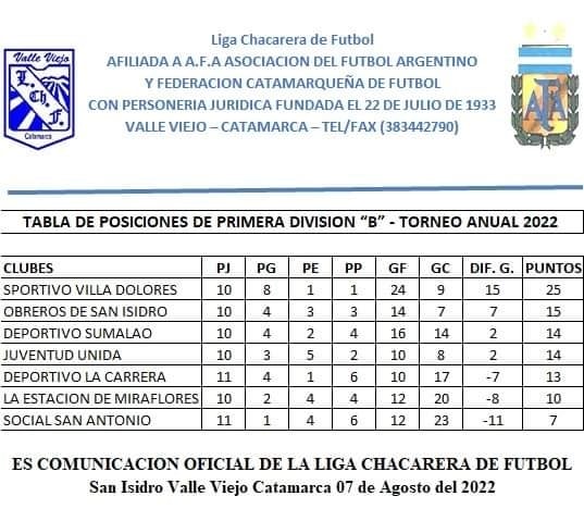 1ra. “B”: Villa Dolores 25 Pts. (Campeón anticipado); Obreros de San Isidro 15; Sumalao y Juventud Unida 14; La Carrera 13; La Estación de Miraflores 10; y Social San Antonio 7 unidades.