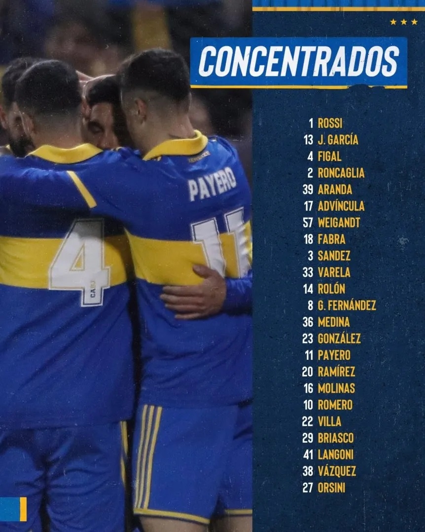 Agustín Rossi; Luis Advíncula, Facundo Roncaglia, Jorge Figal, Frank Fabra; Cristian Medina o Martín Payero, Alan Varela, Guillermo Pol Fernández; Óscar Romero; Sebastián Villa y Luis Vázquez.