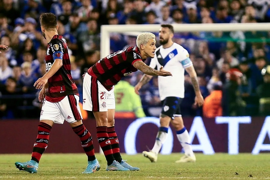 En el complemento Vélez salió a buscar el descuento para ponerse rápido en partido, pero nunca logró llegar con claridad al arco defendido por Santos, y a los 15 minutos del segundo tiempo Flamengo metió el tercero: tras otra gran jugada colectiva, Pedro quedó mano a mano con Hoyos y con una gran definición de derecha anotó el 3-0 para el Fla.