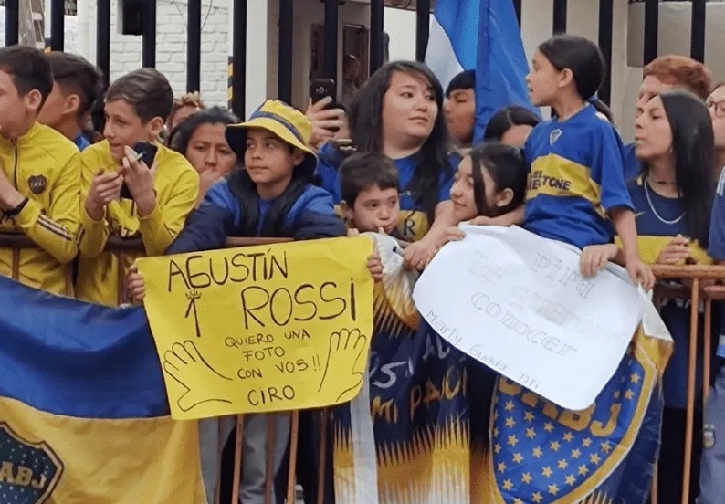 Los hinchas se amontonaron en el hotel a la espera del plantel azul y oro, cantaron durante gran parte de la tarde y les dedicaron carteles a varios referentes. Agustín Rossi y Darío Benedetto, los más requeridos por la gente para una firma o una foto.