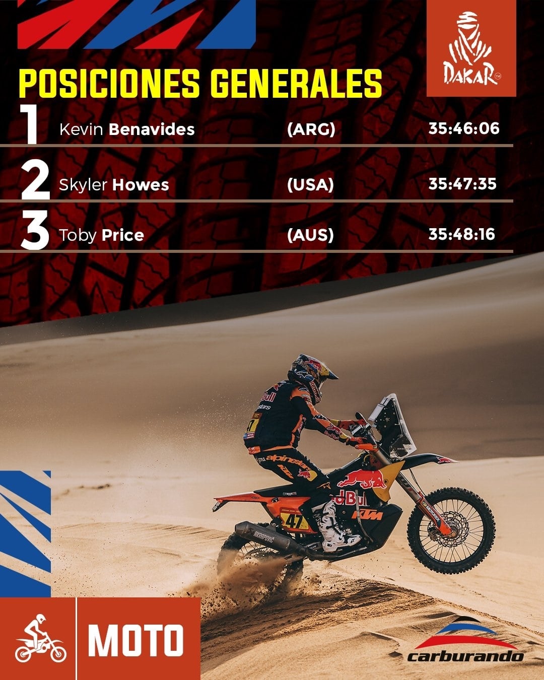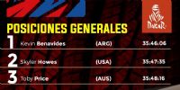 Kevin Benavides es puntero en la tabla general con un registro de 35h46m6s. Segundo aparece Skyler Howes a una diferencia de 1m29s y tercero está Toby Price a 2m10s. Mientras que completan los mejores cinco Van Beveren y Pablo Quintanilla. Por su parte, Franco Caimi culminó en la posición N°9, Luciano Benavides 18° y Diego Llanos se metió en el top 30 al llegar 25°.