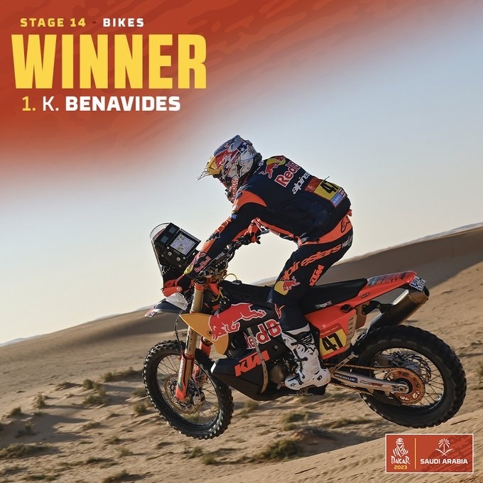 El argentino Kevin Benavides (KTM) conquistó este domingo su segundo Rally Dakar al imponerse en la última etapa del raid, recuperar los 12 segundos de desventaja que tenía con el australiano Toby Price y terminar con 43 de ventaja en la general después de 14 especiales, más el prólogo. La emoción en las motos se mantuvo hasta la última jornada, a la que llegaron tres pilotos con opciones de proclamarse campeones. El de Salta, que había ganado en 2021 con Honda, se llevó el título.