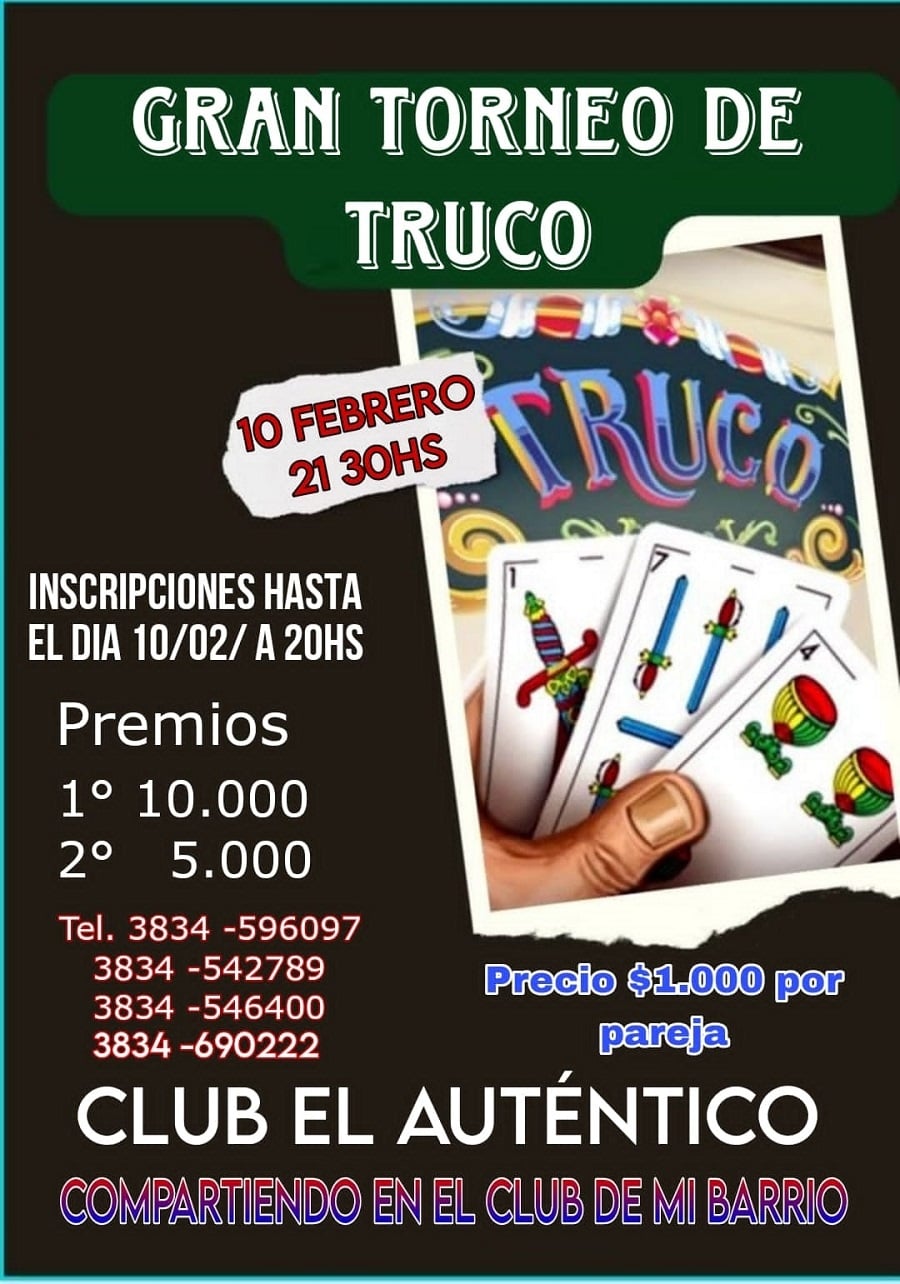 En cuanto al “Gran Torneo de Truco”, por parejas, se informó que se llevará a cabo en la sede de la institución, el 10 de febrero entrante, a partir de las 21 hs.; indicándose que hasta las 20 hs., de esa misma jornada se recibirán las inscripciones.