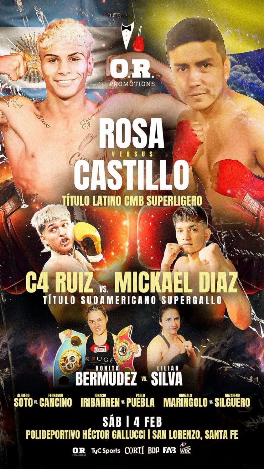En el semifondo, el tucumano Rodrigo "C4" Ruiz (12-0 con 9 KO), arriesgará el título Sudaméricano por primera vez, frente al colombiano Mickael Díaz (7-2 con 5 KO).