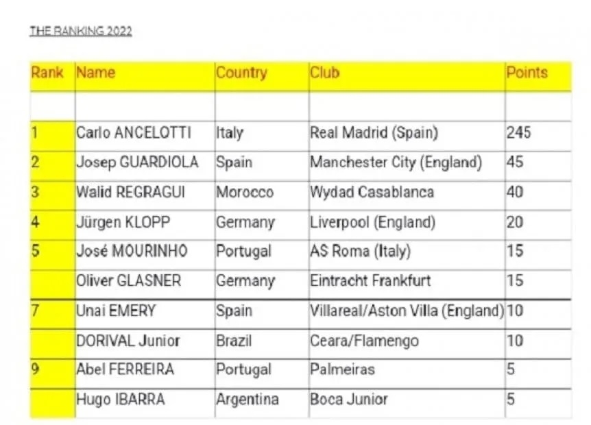 El raking de la IFFHS lo lidera el italiano Carlo Ancelotti (Real Madrid, 245 unidades), y cierran el podio el español Pep Guardiola (Manchester City, 45) y marroquí Walid Regragui (Casablanca, 40).