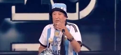 "Tula", quien se consideró "el primer bombo de la historia del mundo", subió caracterizado con la camiseta celeste y blanca, gorro y bombo en mano. De hecho, como si estuviese en una cancha, se dio el gusto de tocar el instrumento que el ex presidente Juan Domingo Perón le obsequió en 1971.