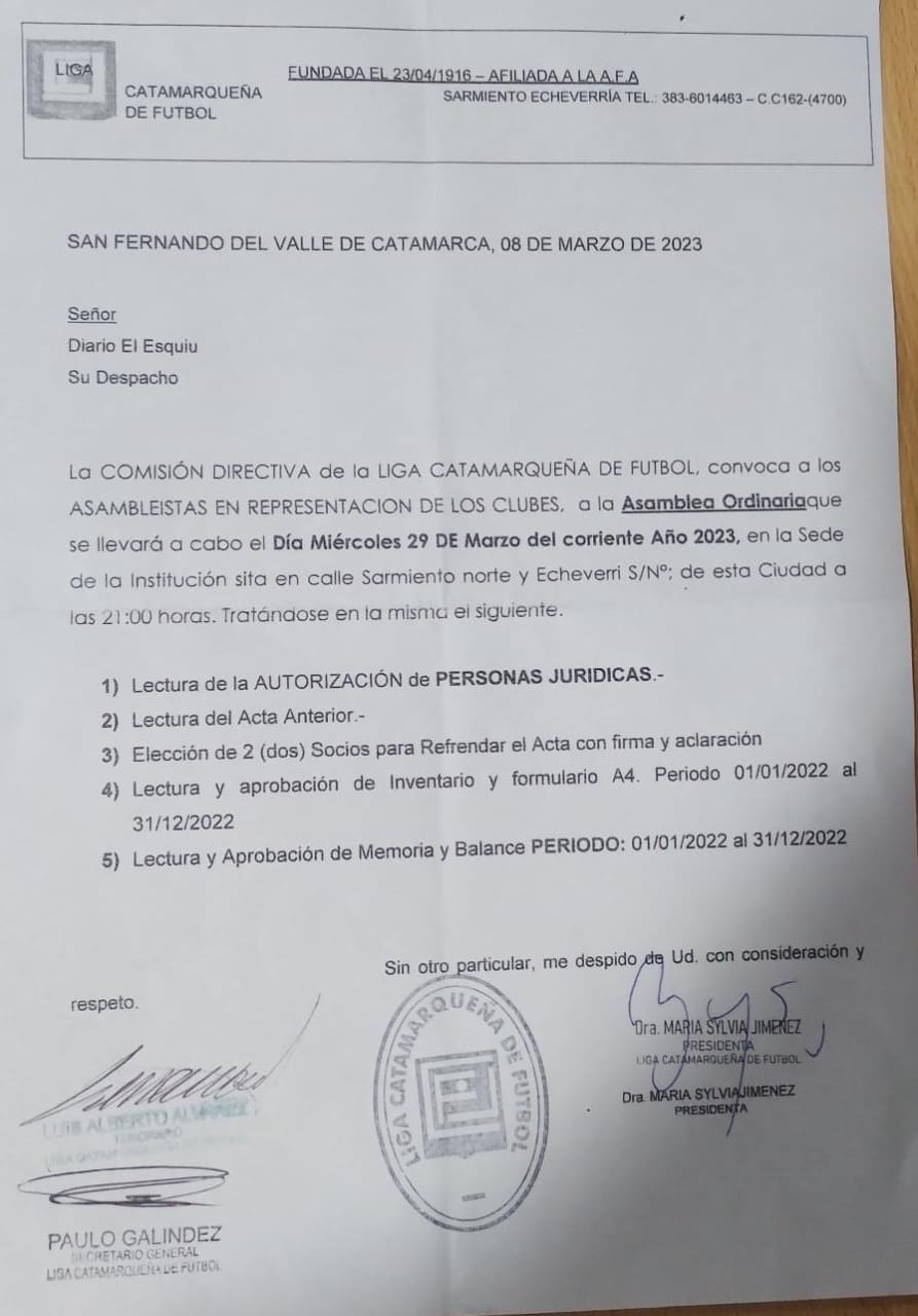 La convocatoria lleva las firmas de la Dra. María Sylvia Jiménez, Luis Alberto Álvarez y Paulo Galíndez, presidenta, tesorero y secretario general de la Liga Catamarqueña de Fútbol.