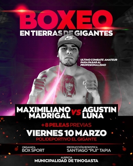 Organizada por Box Sport del promotor Luis Tapia y con auspicio de la Municipalidad de Tinogasta, gestión Sebastián Noblega, la velada tendrá como combate estelar la presencia del tinogasteño Maximiliano Madrigal, actual campeón amateur de Catamarca (más de 91 Kg.) y de La Rioja (hasta 91 Kg.), que se medirá ante el santiagueño Agustín Luna.