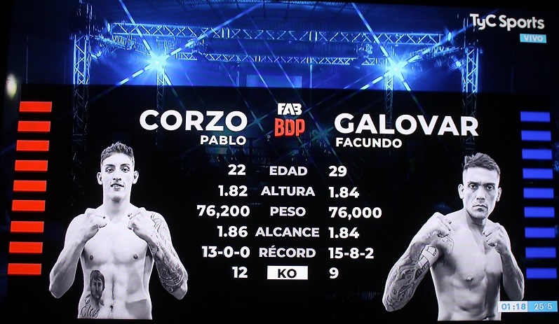 Los primeros tres episodios invitaban a imaginar una extraordinaria presentación del N°7 del ranking supermediano AMB, Pablo Corzo, que desplegó un boxeo muy versátil, dominando el centro del cuadrilátero y cediendo la iniciativa a Galovar por momentos, contragolpeando de manera muy agresiva con su cross zurdo, provocando un hematoma en el pómulo izquierdo del tucumano.