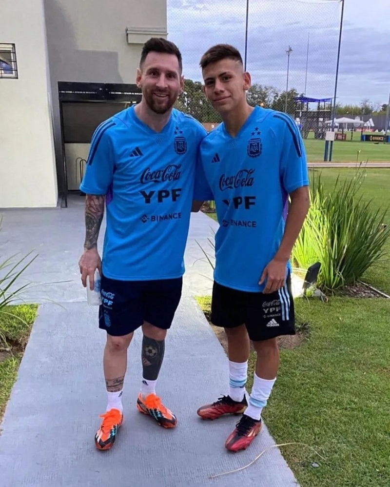 El Diablito se sumó al entrenamiento cuando este estaba empezado por decisión del técnico y en las imágenes se ve como saluda uno por uno a los futbolistas campeones del mundo. La curiosidad es que luego de darle la mano a Scaloni el primero que lo recibe es ni más ni menos que Lionel Messi. Sin dudas será un día inolvidable para el juvenil que luego publicó en Instagram una foto junto a la Pulga y escribió: "Sueño cumplido".