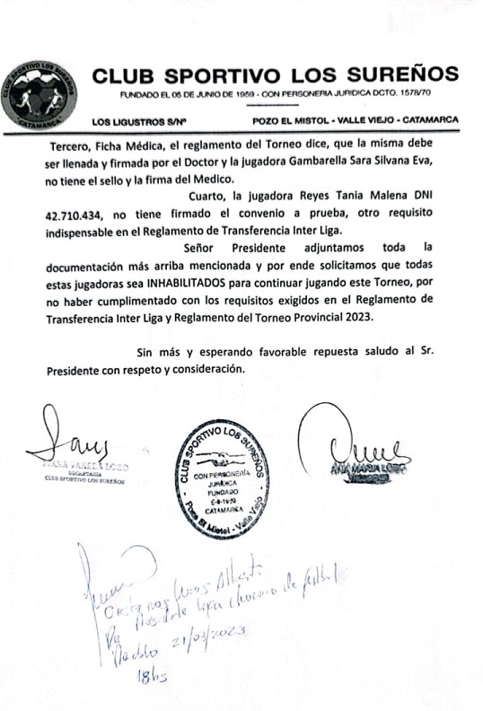 “Los Sureño reconoce errores”, reiteró la titular de Los Sureños, acotando que “el Comet (informe actualizado de los fichajes) debe ser firmada por el presidente de la institución y el médico y hay varias jugadoras que aparecen sin esas firmas”.